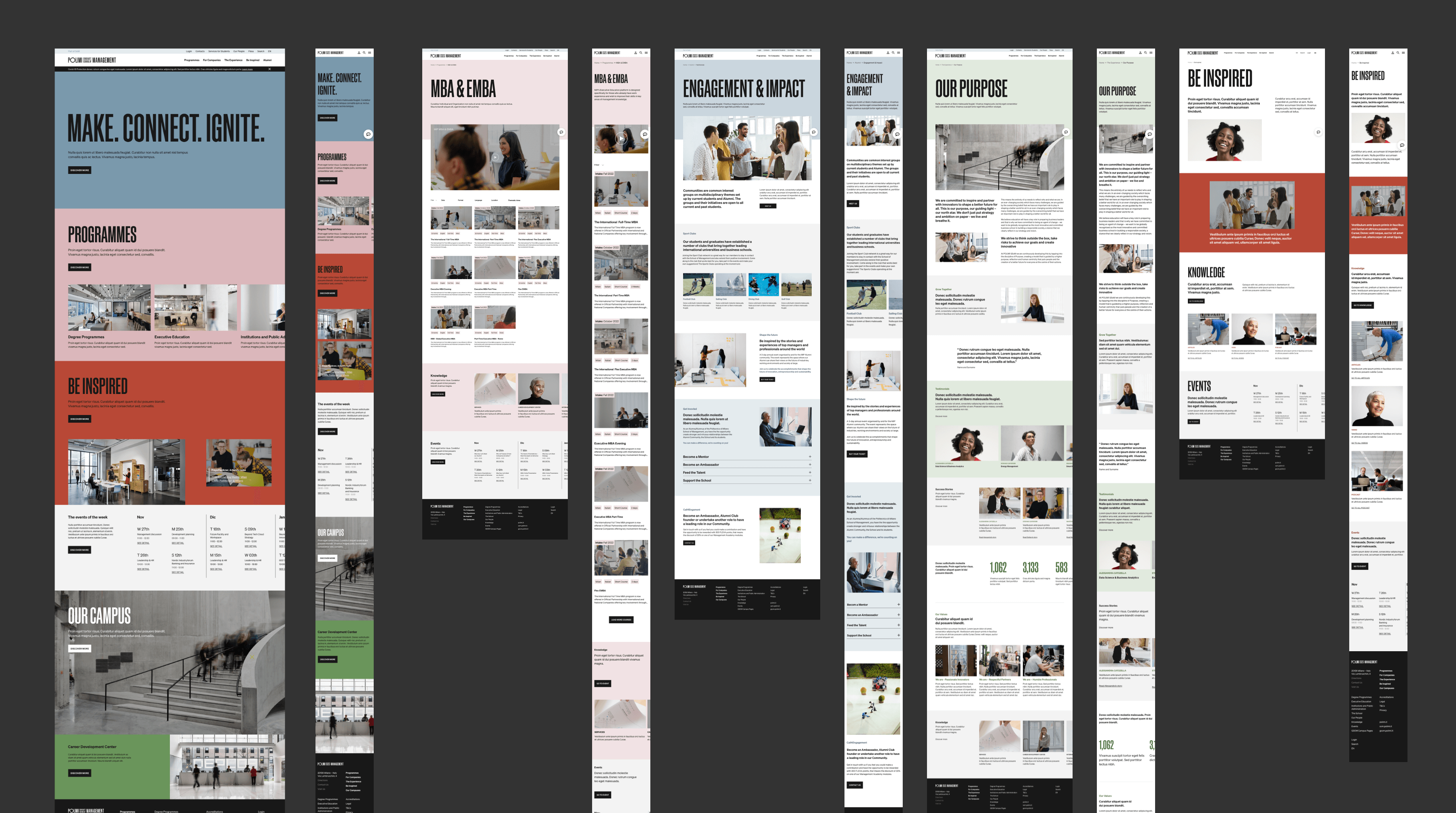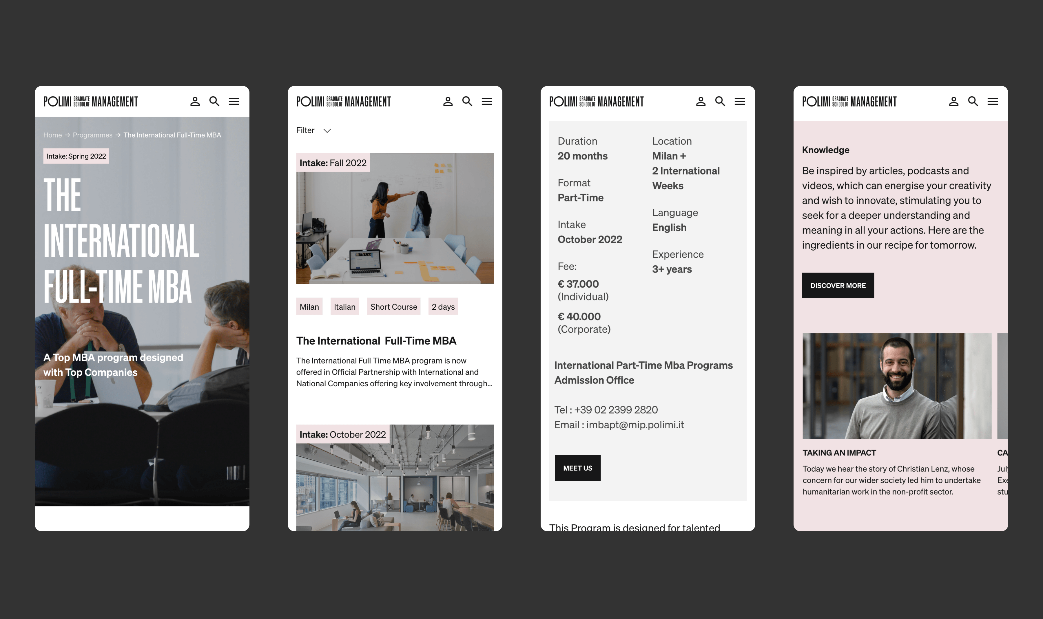 With the vision of a holistic brand agreed, efforts turned to translating this across the POLIMI website and digital spaces. This began with a completely refreshed and deeply considered information architecture, built on audience use cases, that defined a clear sitemap for a customer-oriented navigation system. Then, prototyping user flows and pages, the new brand identity evolved into a design system of foundational components that will ensure consistent cross-device branded experiences.