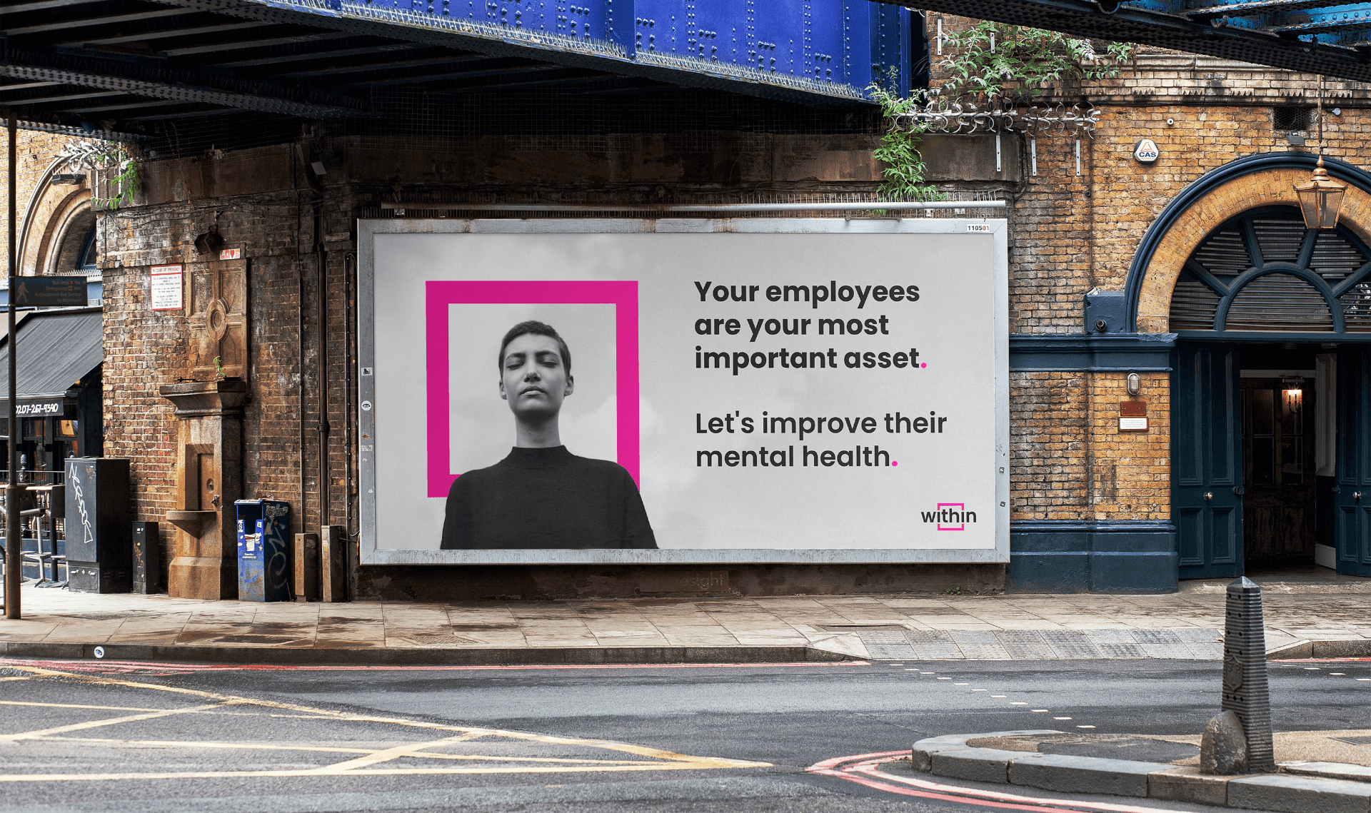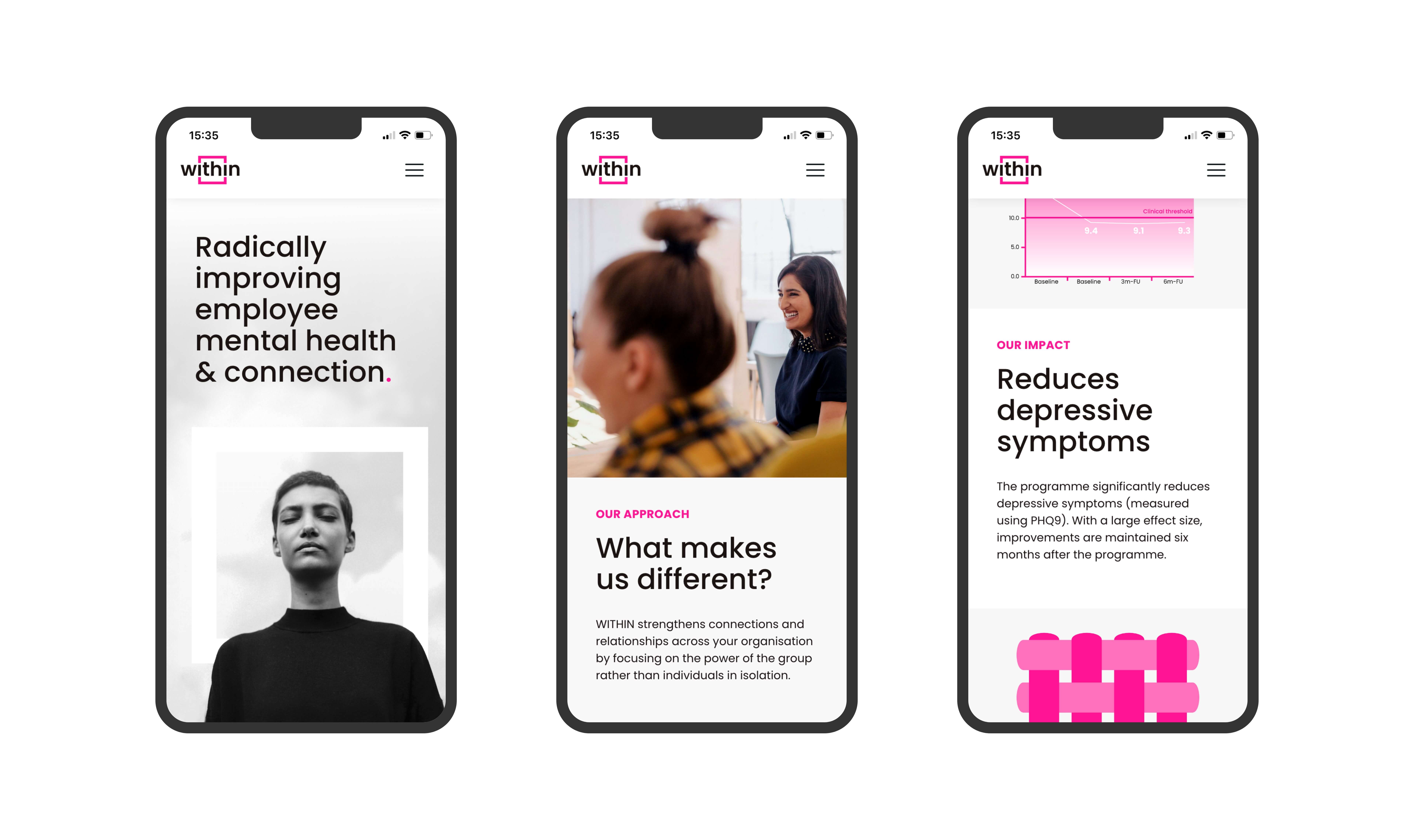 A bold approach was taken into the initial design explorations in order to reflect the personality that the business required. This was driven by the selection of a monochrome + hot pink colour palette, partly as a nod to the relationship that WITHIN has with Talk for Health, but more to represent the brand’s simple, straight and digital first tonality and to separate it from an already congested space.